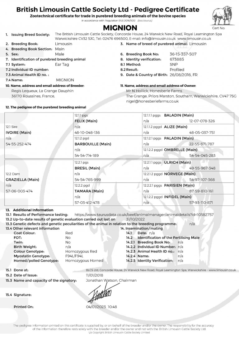 Mignion was bred by Regis Lequex he is out of Graziella RR a cow with tremendous balance DM 106 and DS 107 she is by Bresil MN RREVS an easy calving cow with high milk values. Mignion has volume, power and presence breeding some great calves.